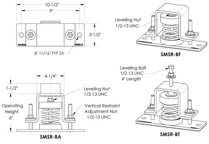 • SMSR-BT: bolted top with leveling adjustment feature – most common variation when equipment can be directly bolted on top of these vibration dampers.